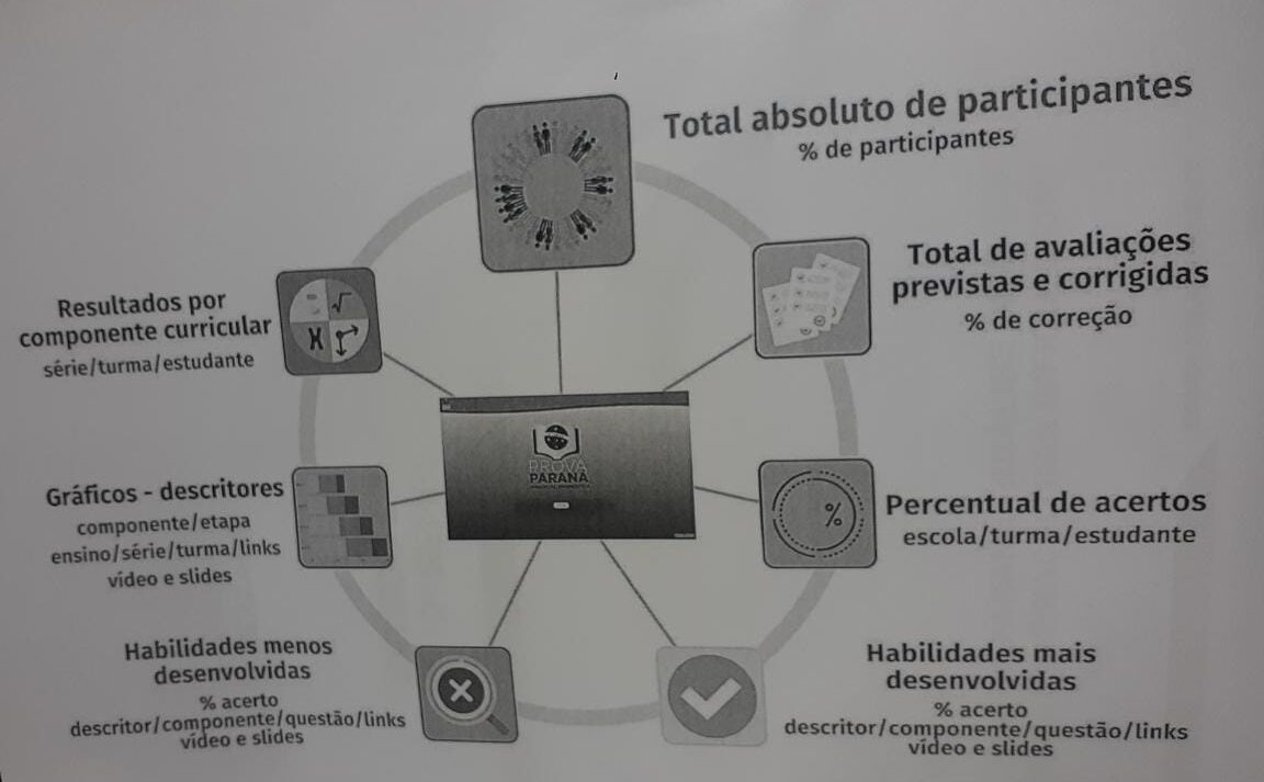 Isso se evidencia quando a Secretaria propõe, no dia de hoje, a Prova Paraná como um tema orientador do planejamento das disciplinas. Através do B.I, as escolas deverão acessar os resultados das provas e indicadores, estabelecendo o planejamento a partir de um conjunto de descritores. Os descritores utilizam como métrica testes de larga escala, como a prova Brasil e a Pisa.