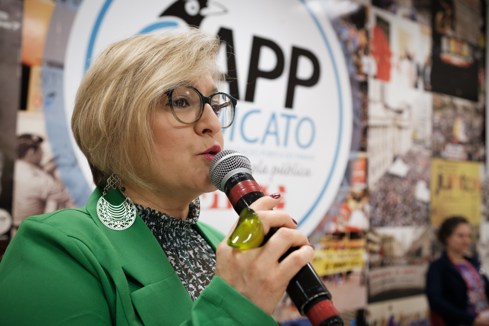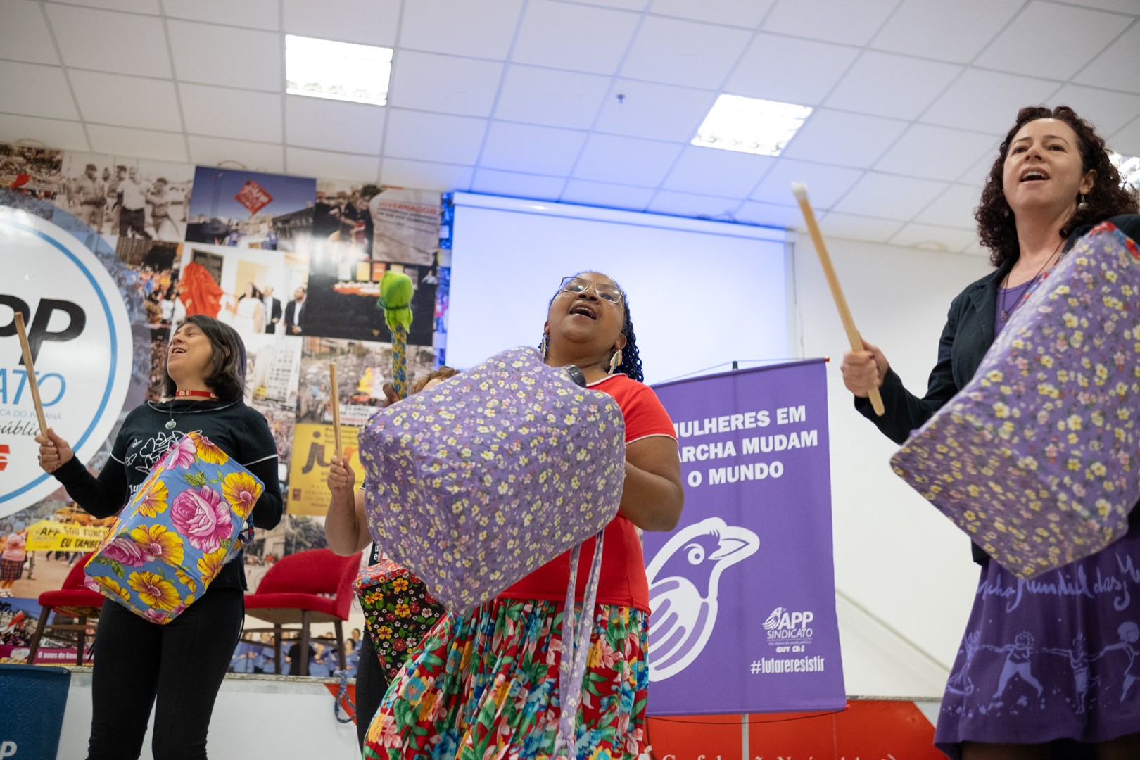 O dia começou com uma intervenção cultural da Marcha Mundial das Mulheres (MMM), com batucada e apresentação do histórico do movimento pela voz da secretária da Mulher Trabalhadora da APP-Sindicato, Taís Adams.