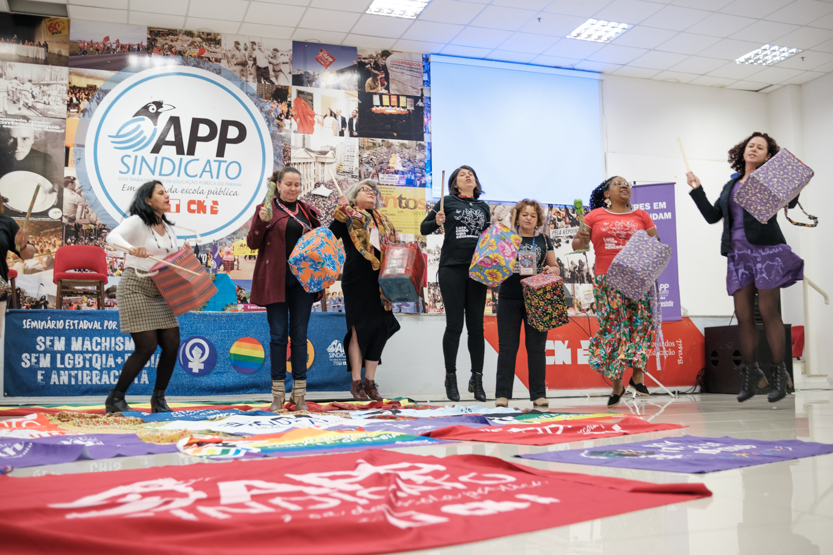 O dia começou com uma intervenção cultural da Marcha Mundial das Mulheres (MMM), com batucada e apresentação do histórico do movimento pela voz da secretária da Mulher Trabalhadora da APP-Sindicato, Taís Adams.