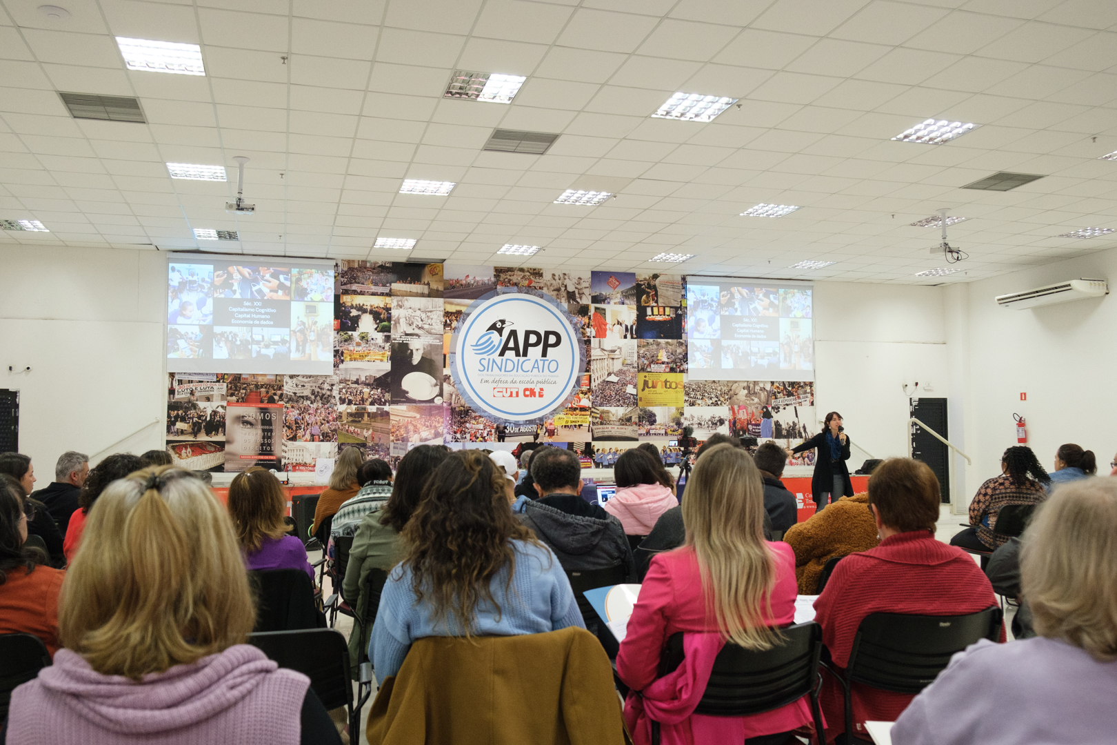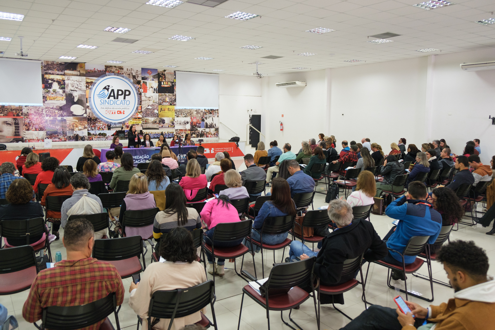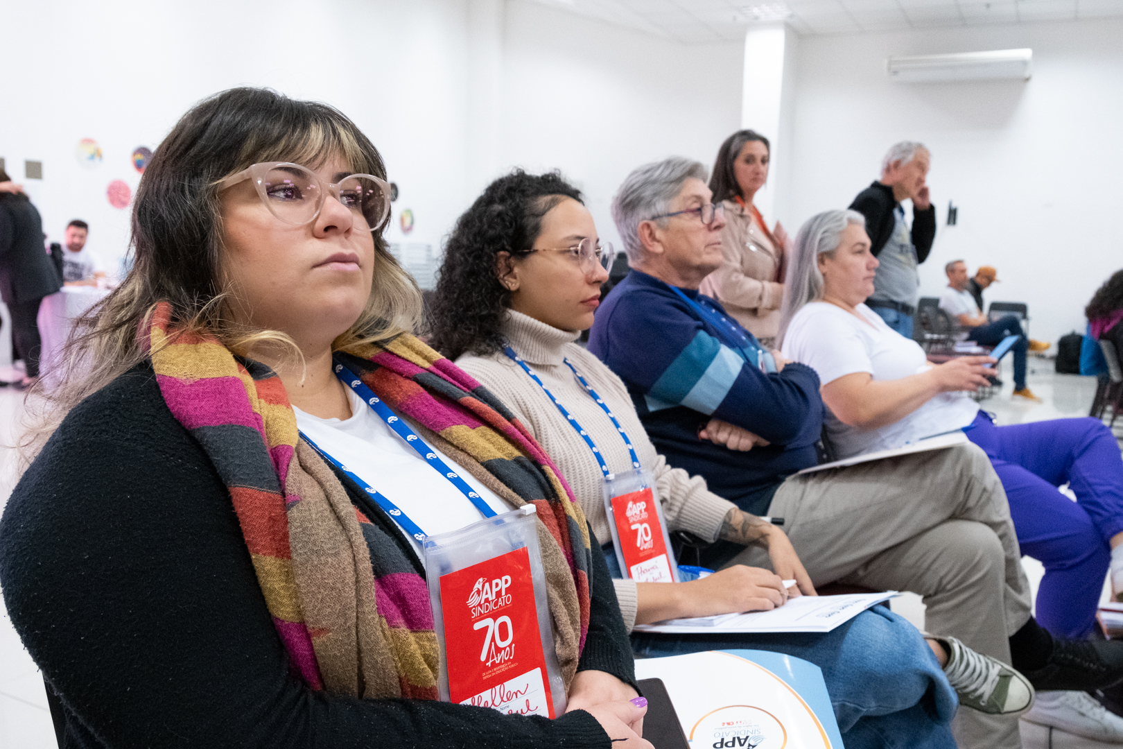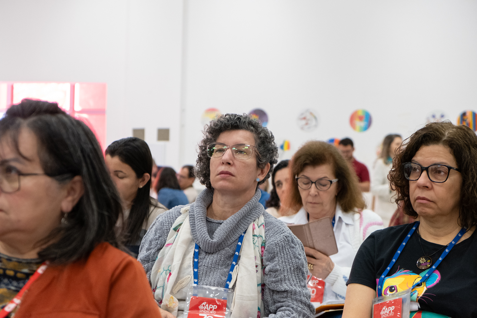 A partir das provocações da mesa de abertura, os(as) presentes se dividiram em grupos de trabalho à tarde para construir coletivamente a posição da APP e as estratégias de luta da categoria.