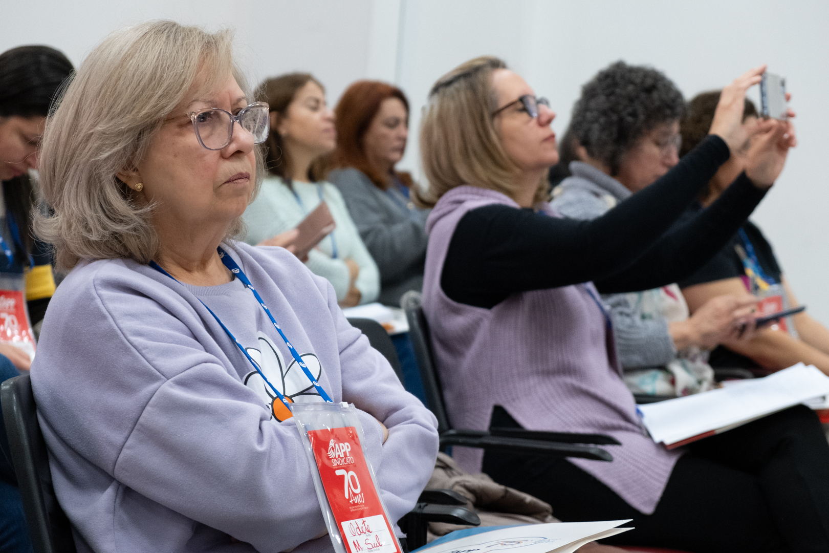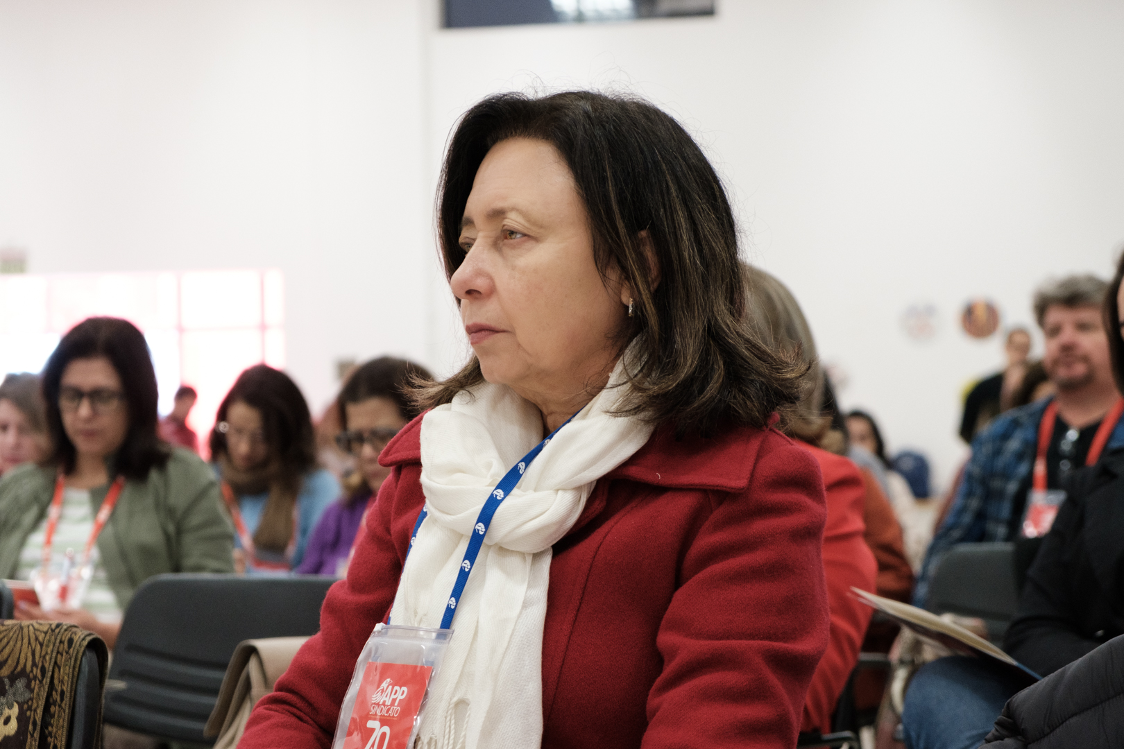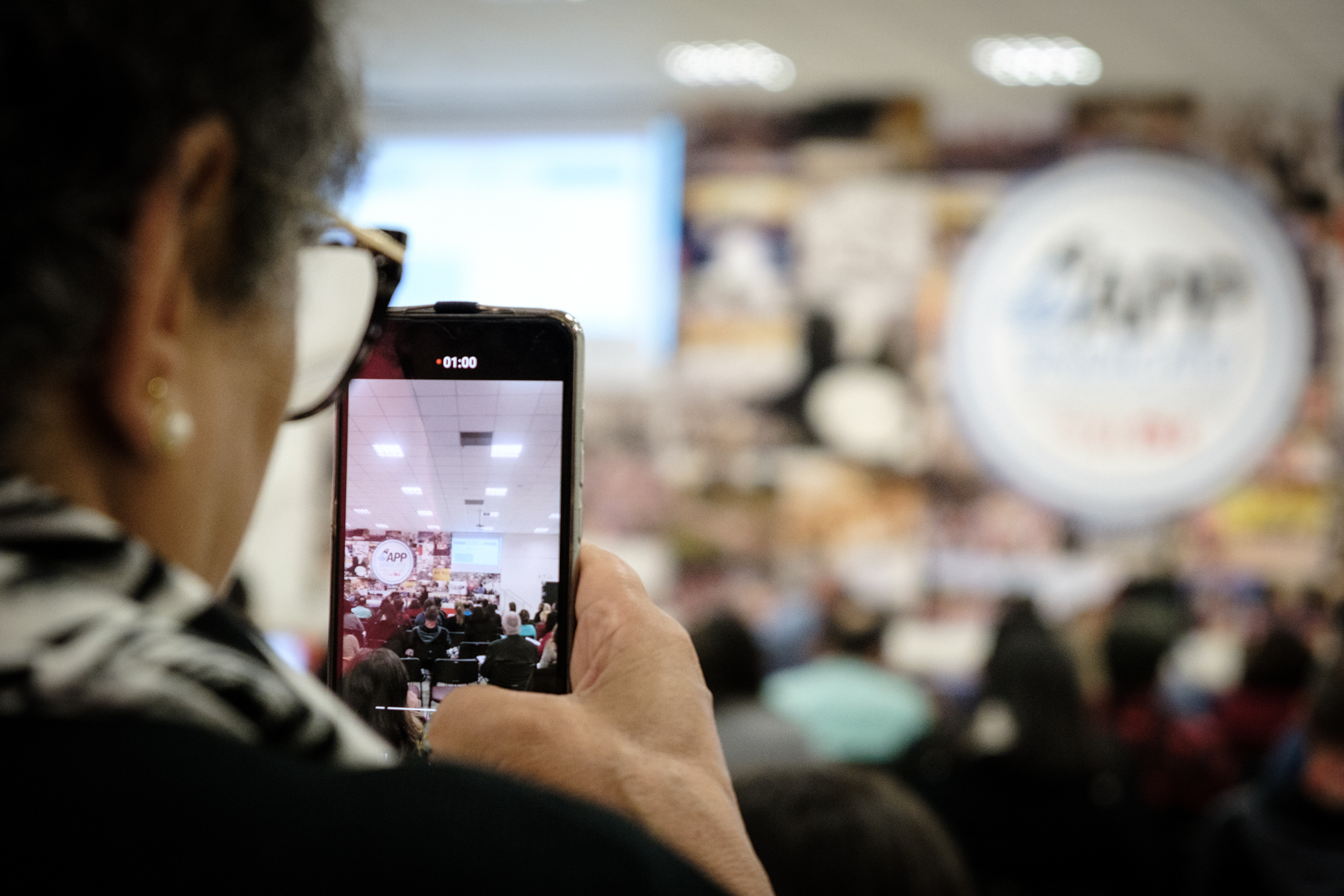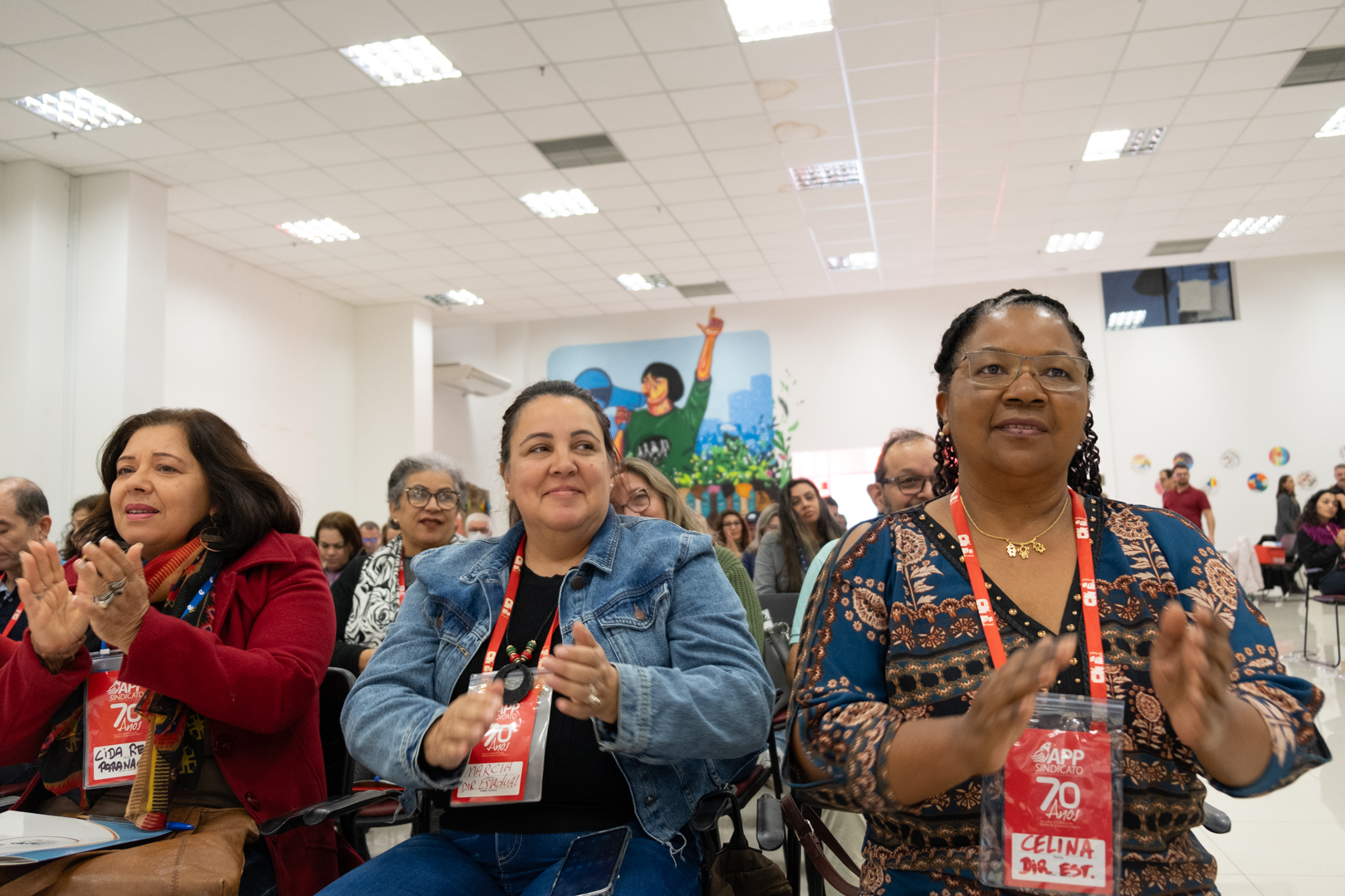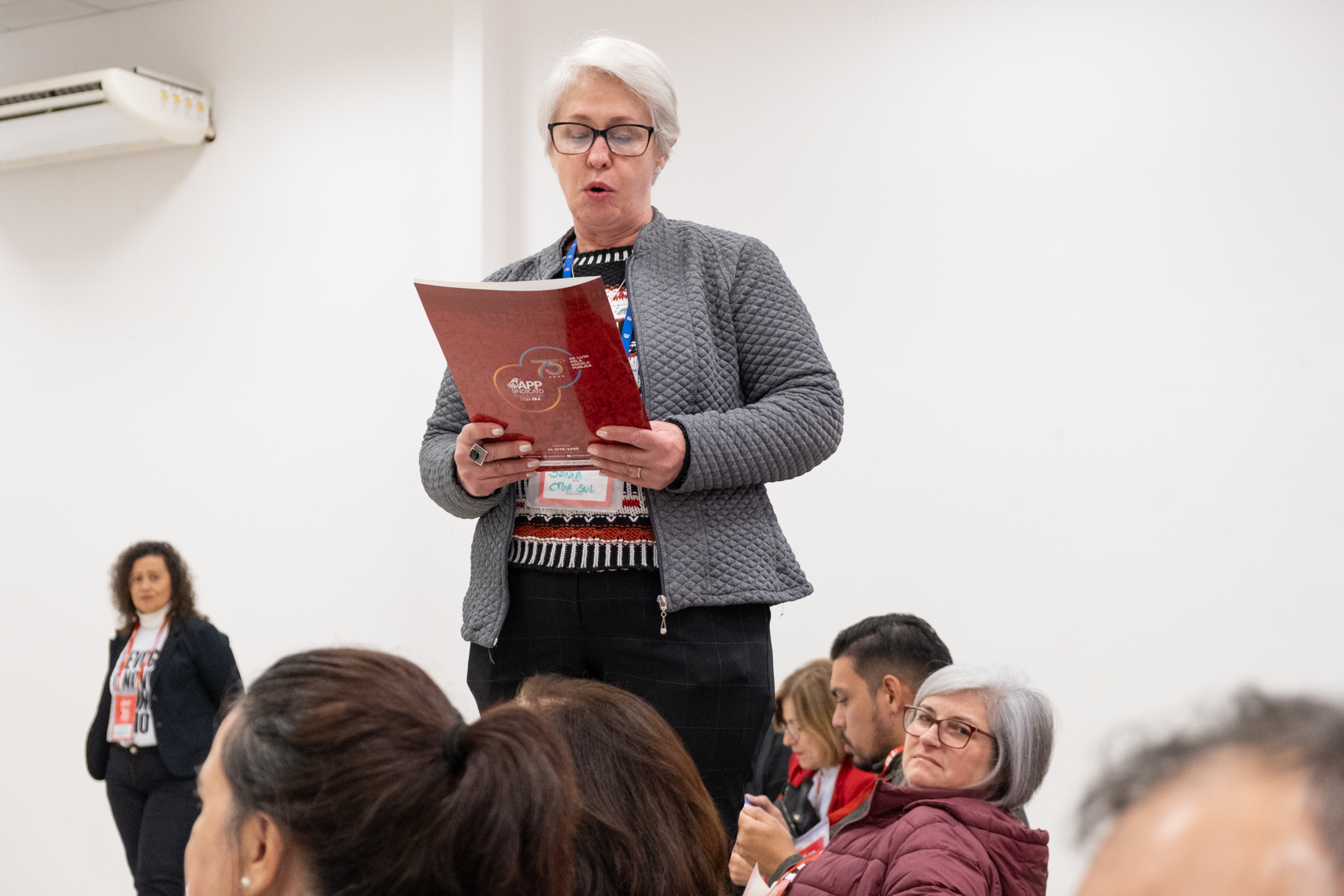 A partir das provocações da mesa de abertura, os(as) presentes se dividiram em grupos de trabalho à tarde para construir coletivamente a posição da APP e as estratégias de luta da categoria.