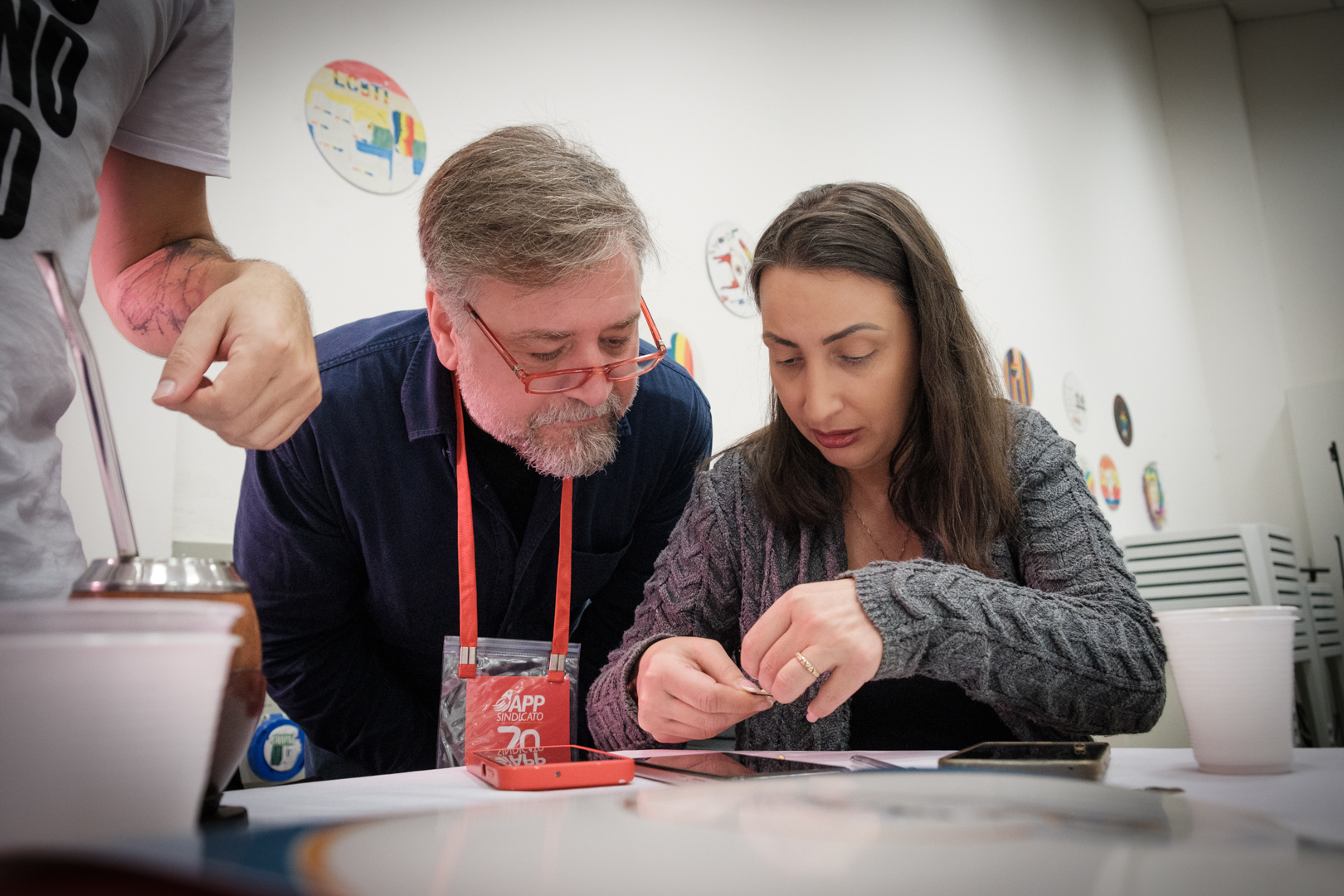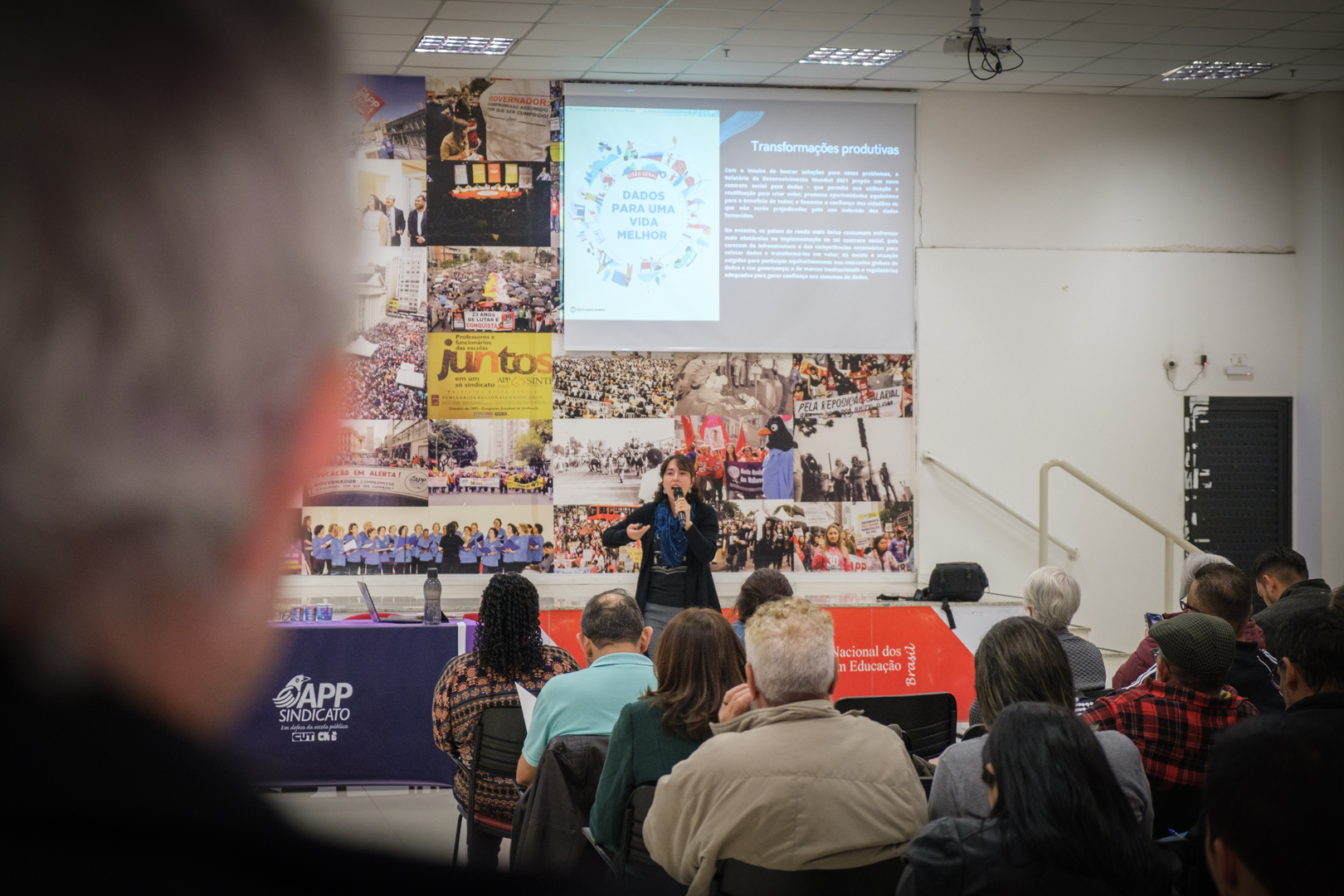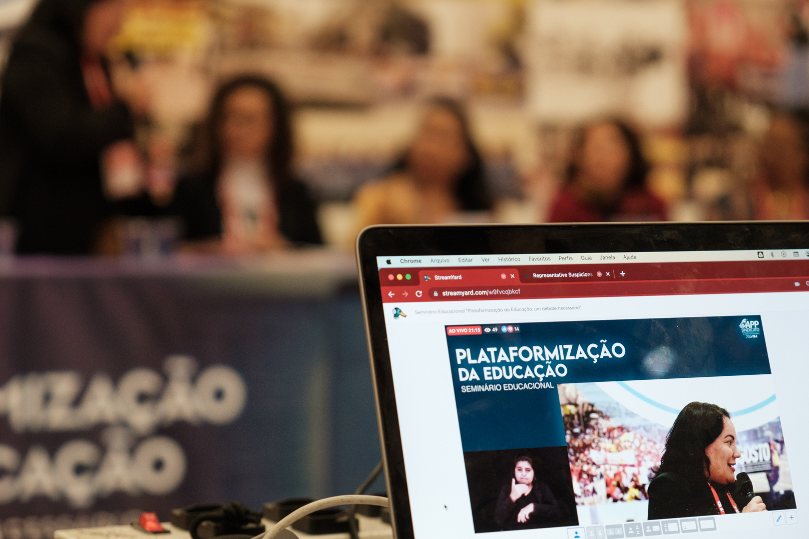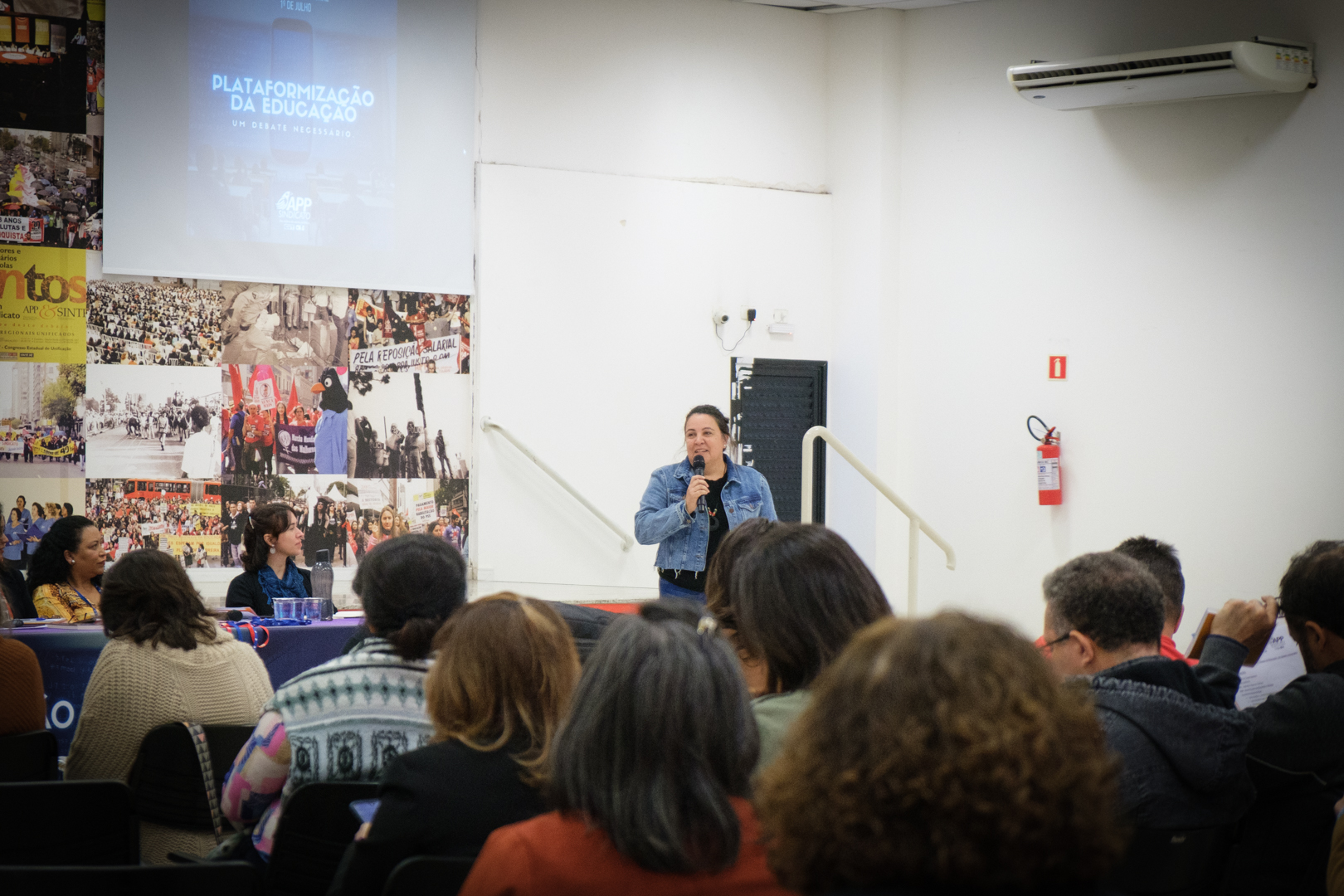 “Se não é possível acabar com as plataformas, o que nós vamos fazer com elas? Como transformá-las em instrumentos de apoio pedagógico, e não de imposição e de captura da educação pública por atores privados? Como organizamos a nossa vida na escola e a nossa resistência, mas também a disputa deste espaço?”, questionou Walkiria Mazeto antes da formação dos grupos.