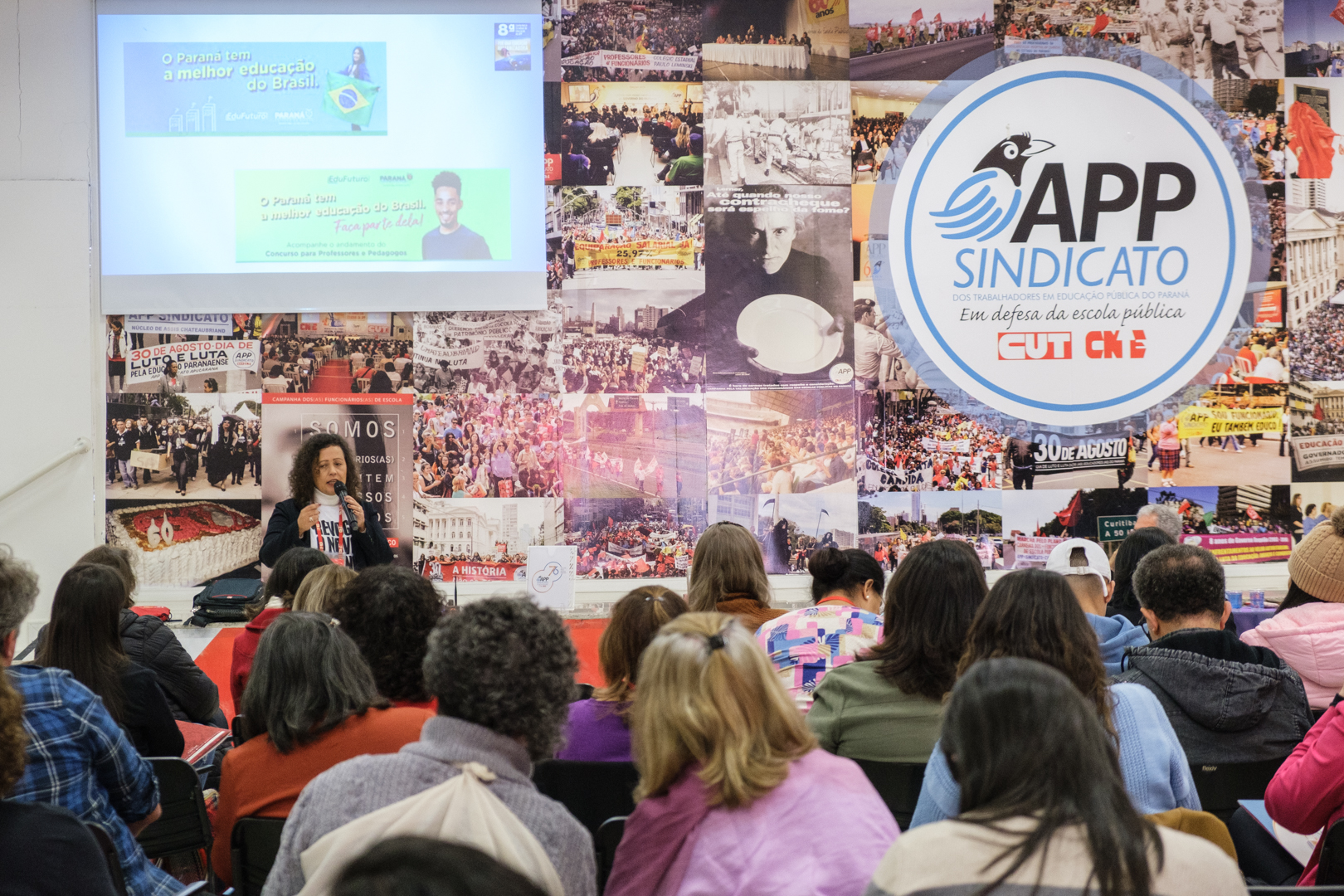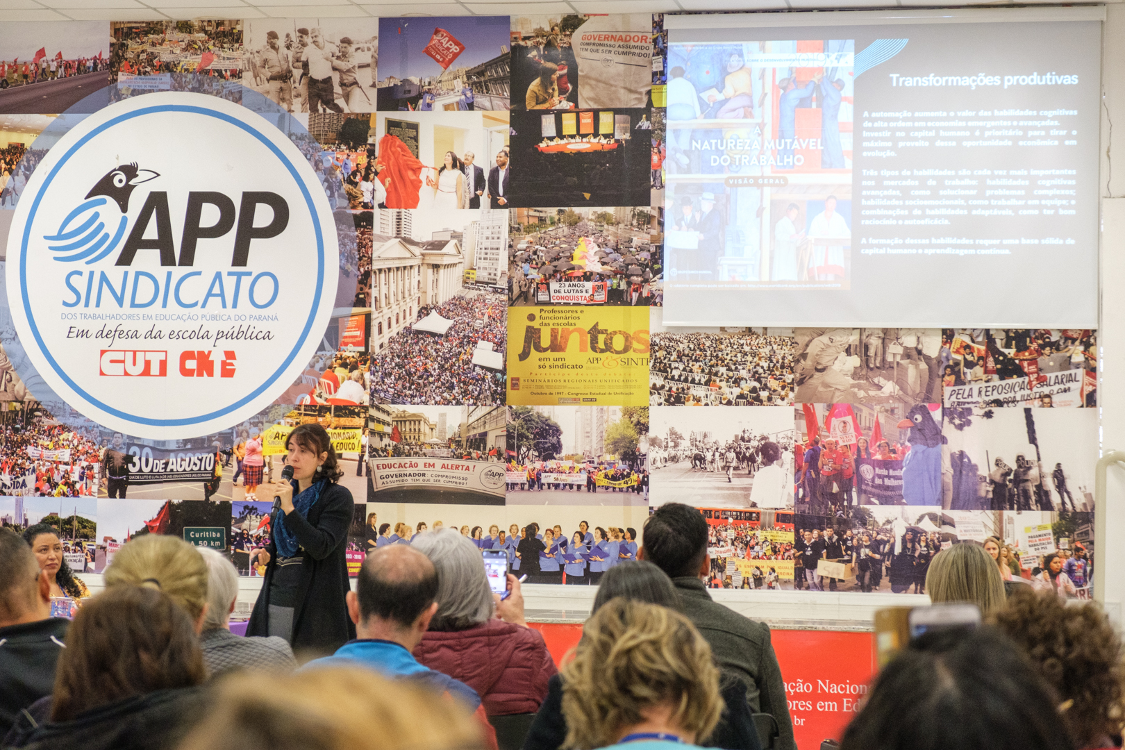 Organizado pela Secretaria Educacional, o seminário “Plataformização da educação: um debate necessário” lotou o auditório da sede estadual da APP para refletir sobre o tema e partir da crítica para a ação crítica, construindo estratégias de resistência e enfrentamento. A mesa da manhã, com a presença da Profª. Drª. Carolina Batista Israel, da UFPR, e do Prof. Dr. Roberto Moraes Pessanha, da UFRJ, foi transmitida ao vivo nas redes do Sindicato.