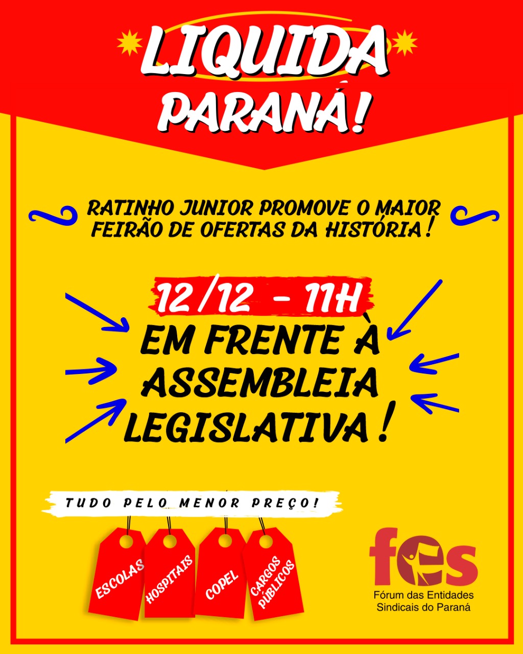O governador Ratinho Junior está liquidando o Paraná. Além da venda da Copel e do processo de privatização de 27 escolas, o Executivo enviou à Assembleia Legislativa cerca de 30 Projetos de Lei em pleno dezembro e em meio à Copa do Mundo.