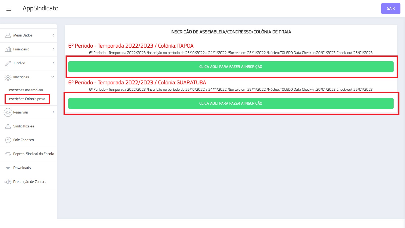 As inscrições deverão ser feitas exclusivamente pelo sistema “Minha Sindicalização”, no botão “Inscrições” da aba lateral.