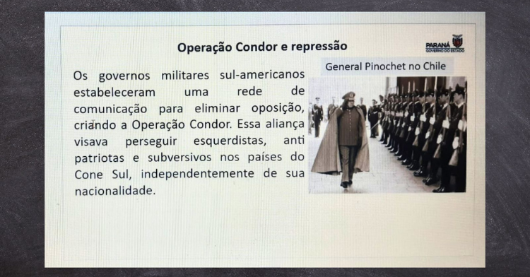 Mas segundo um slide disponibilizado pela Secretaria da Educação do Paraná (Seed) para professores(as) repassarem o conteúdo aos(às) estudantes, as vítimas dos horrores da ditadura seriam “antipatriotas” e “esquerdistas’.