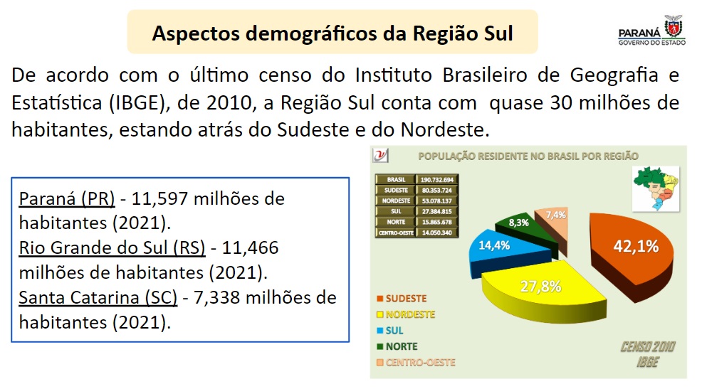 O mesmo slide traz um erro de matemática. “De acordo com o último censo do IBGE, de 2010, a Região Sul conta com quase 30 milhões de habitantes”, informa uma página para em seguida detalhar: Paraná – 11,597 milhões de habitantes (2021); Rio Grande do Sul (RS) – 11,466 milhões (2021); Santa Catarina (SC) – 7,338 milhões (2021).” Se somar, dá 30,401 milhões, o que é mais de 30 milhões e não quase 30 milhões.