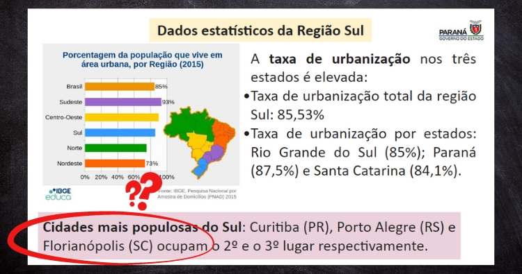 A redação das frases do slide é péssima, revelando total desprezo pelos estudantes e professores(as). É o que acontece no trecho “Cidades mais populosas do Sul: Curitiba (PR), Porto Alegre (RS) e Florianópolis (SC) ocupam o 2º e o 3º lugar respectivamente”. Três cidades ocupam dois lugares no mesmo ranking?