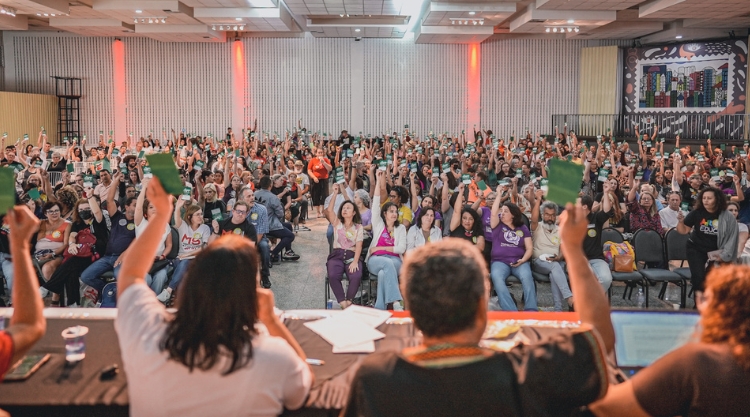 Educadores(as) da rede estadual de todo o Paraná lotaram o Espaço Torres, em Curitiba, para a Assembleia Estadual da APP-Sindicato na manhã deste sábado (1º).