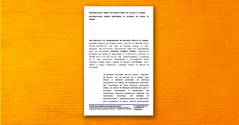>> Receba notícias da APP no seu Whatsapp ou Telegram A direção estadual da APP-Sindicato peticionou o Ministério Público Estadual (MP-PR) e o Tribunal de Contas do Estado (TCE) para investigar e apurar a legalidade do contrato entre a Seed e a Unicesumar. O governo contratou a empresa para assumir aulas de três cursos técnicos […]