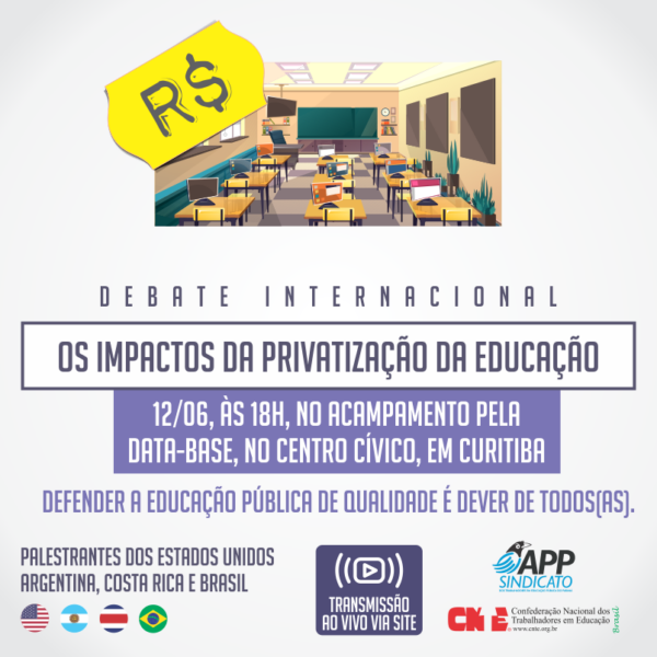 Hoje (12) é dia de (re)pensar a educação pública. A APP-Sindicato e CNTE organizam uma roda de conversa, logo mais às 18h, no acampamento do Fórum das Entidades Sindicais (FES), que acontece desde ontem (11) em frente ao Palácio Iguaçu. Todos e todas estão convidados(as) para participar da Roda de Conversa sobre a mercantilização da […]