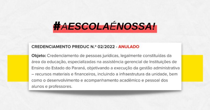 >> Receba notícias da APP por Whatsapp ou Telegram O governo Ratinho Junior suspendeu nesta quinta-feira (10) o Edital 02/2022 da Paraná Educação, que coloca à venda 27 escolas da rede estadual. Mas não há o que comemorar; outro edital, o 03/2022, já está no ar, maquiando pontos críticos denunciados pela APP sem, no entanto, abrir […]