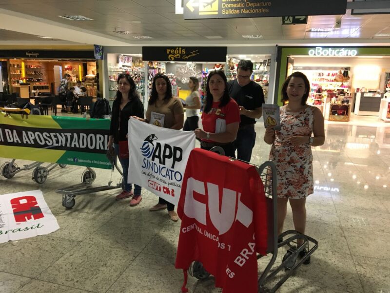 A manhã desta segunda-feira (04) começou muito cedo para os(as) representantes da categoria que estiveram, desde antes das 6h da manhã, no aeroporto Afonso Pena, em Curitiba para cobrar dos(as) deputados(as) federais, que viajavam à Brasília, para que se posicionem contra à Reforma da Previdência. A votação, que aconteceria nesta terça-feira (05) foi adiada, graças […]